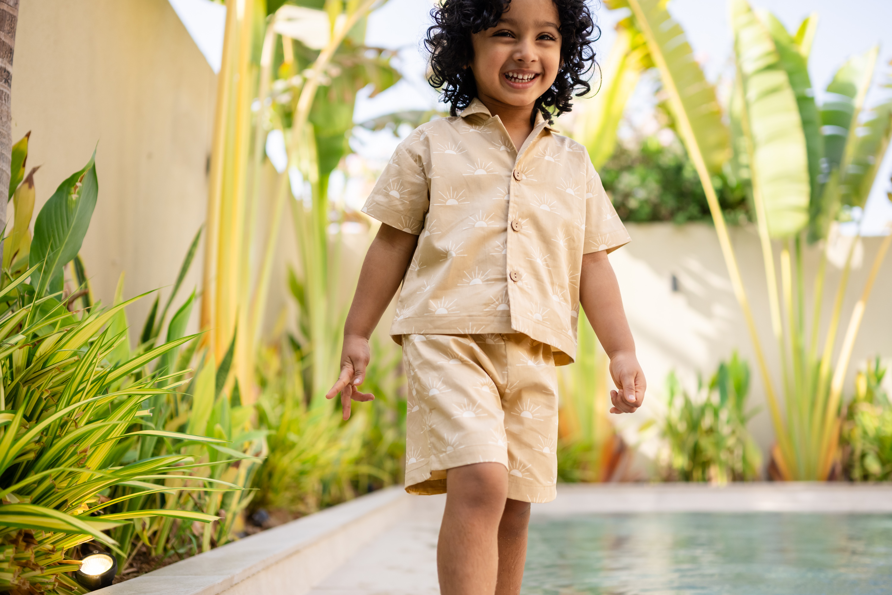 Featuring exclusive patterns inspired by nature – Blue Waves, a calming design that echoes ocean tides, and Boho Suns, a warm, playful print celebrating the sun’s golden glow – this set is perfect for beach days, family outings, or simply exploring the world around them. The button-up shirt boasts a classic collar and short sleeves for a polished yet relaxed look, while the elastic-waist shorts ensure easy movement and a snug fit, making this set as functional as it is fashionable. Lovingly made in Bali, this outfit is a testament to Woven Wild’s commitment to sustainability, style, and global craftsmanship.
