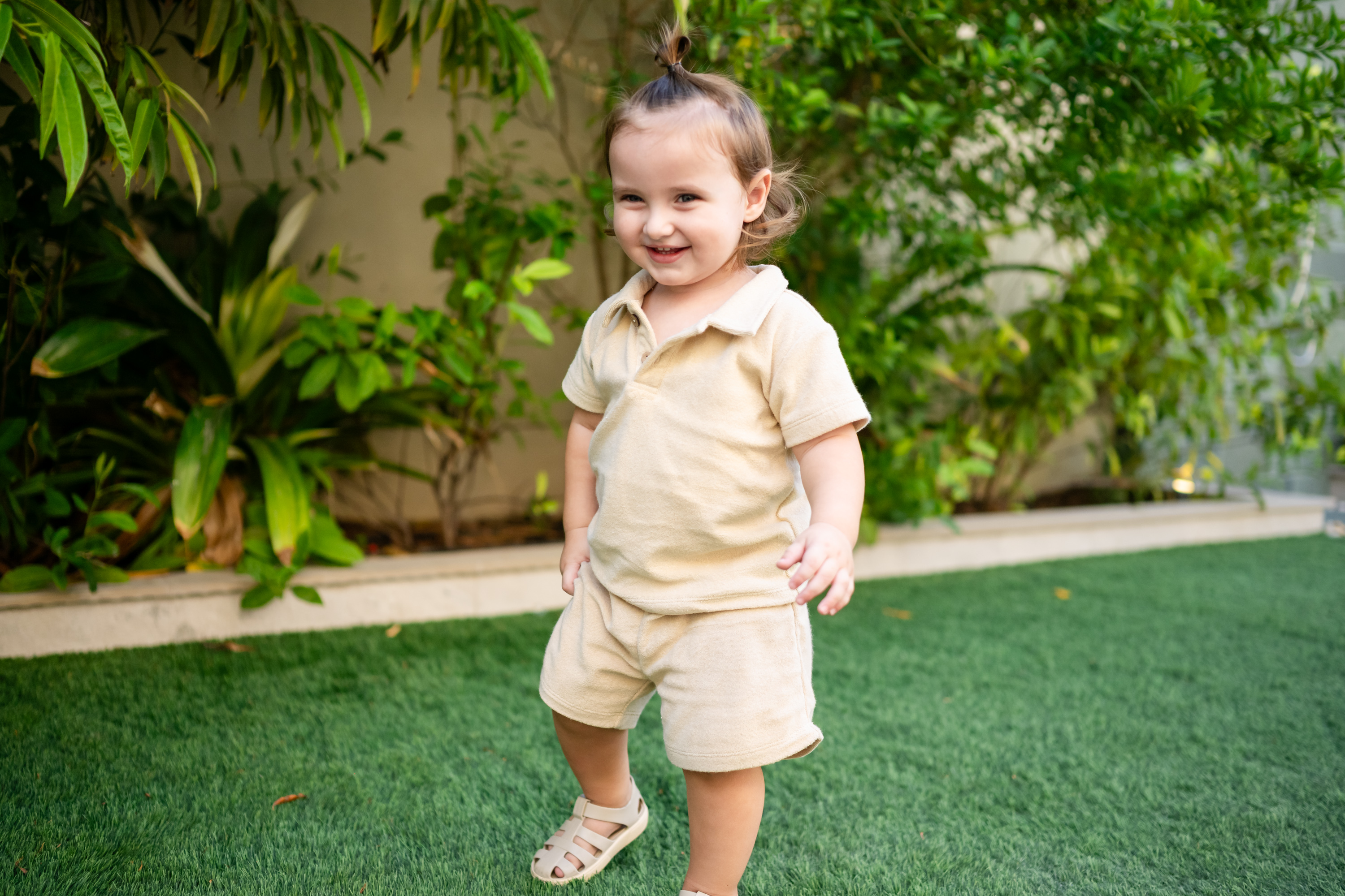 Available in our signature ‘Summer Sage’ and ‘Sandshell’ and inspired by nature, the Woven Wild Coord reflects our commitment to practical fashion. It’s easy to mix and match with other wardrobe favorites and pairs perfectly with sandals or trainers for any outdoor adventure. Crafted with care and designed to last, this coord is made with sustainable materials, keeping the planet and your little one’s future in mind.
